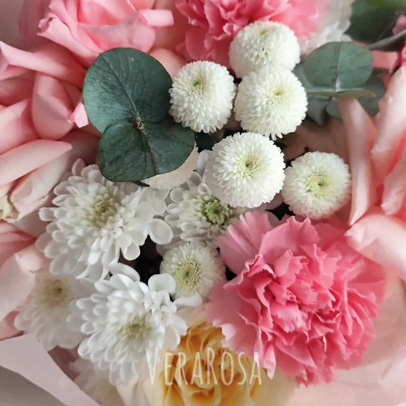 Кустовые розы были органично обрамлены веточками эвкалипта и гипсофилами. Спасибо вашей команде за то, что учли все мои пожелания. Лучшие