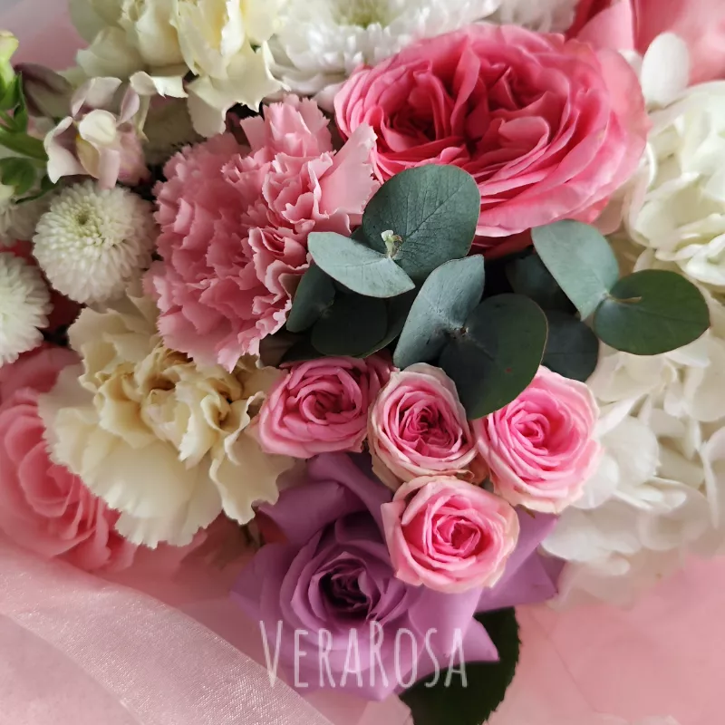 Кустовые розы были органично обрамлены веточками эвкалипта и гипсофилами. Спасибо вашей команде за то, что учли все мои пожелания. Лучшие