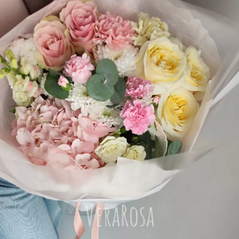 Кустовые розы были органично обрамлены веточками эвкалипта и гипсофилами. Спасибо вашей команде за то, что учли все мои пожелания. Лучшие