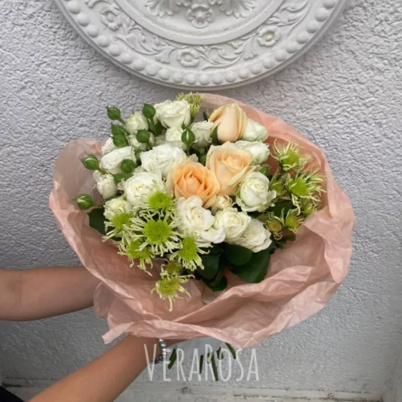 Кустовые розы были органично обрамлены веточками эвкалипта и гипсофилами. Спасибо вашей команде за то, что учли все мои пожелания. Лучшие