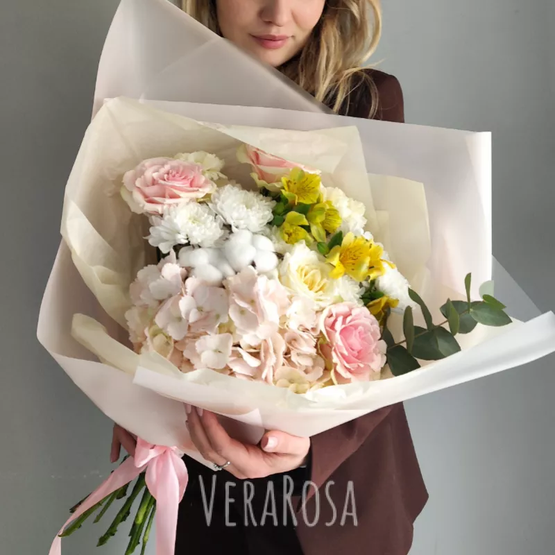 Нежный букет в пастельных тонах, созданный из пышных гортензий, утонченных роз и воздушного хлопка, станет идеальным выражением Ваших чувств. Яркие акценты альстромерии и зелень эвкалипта придают ему завершенный, изысканный вид.