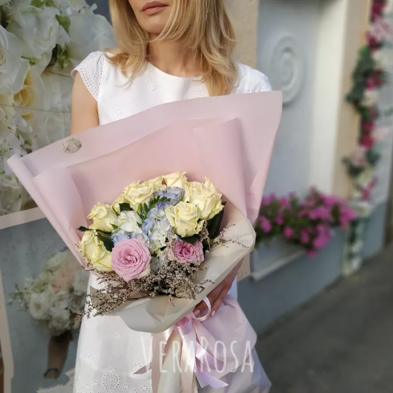 Кустовые розы были органично обрамлены веточками эвкалипта и гипсофилами. Спасибо вашей команде за то, что учли все мои пожелания. Лучшие