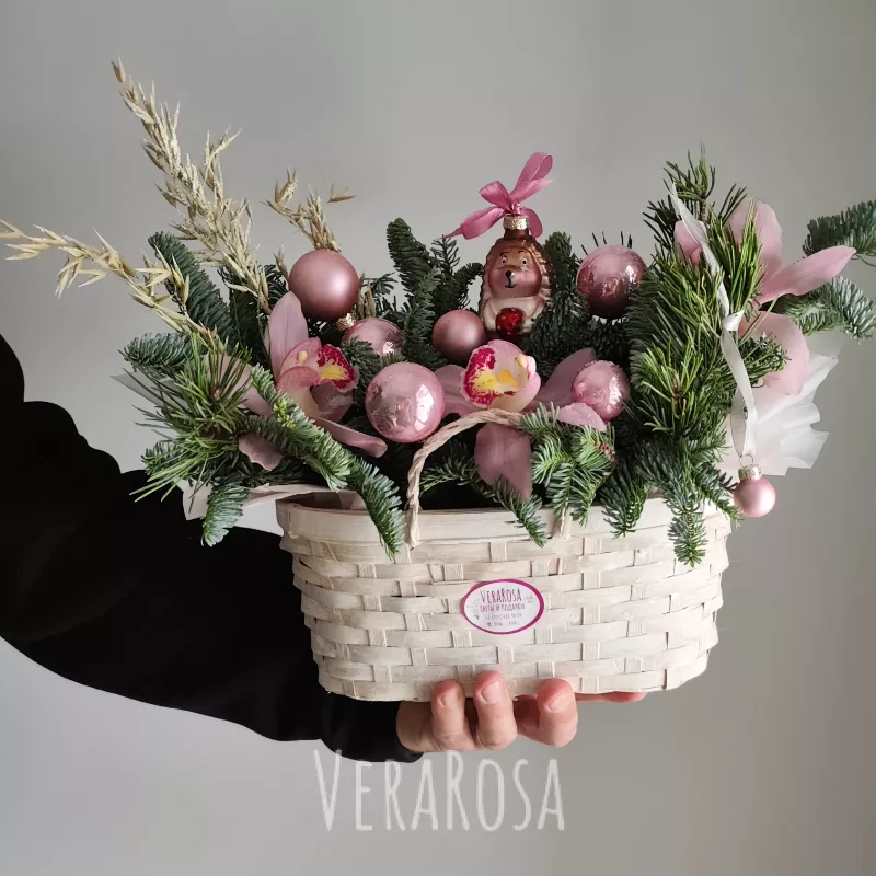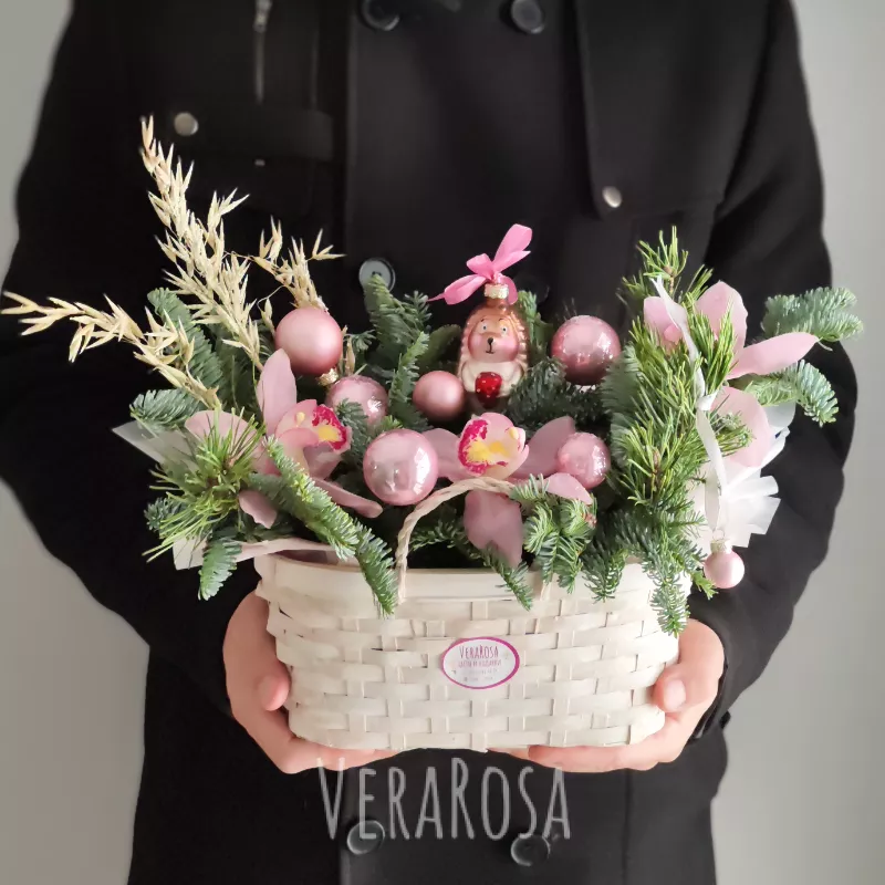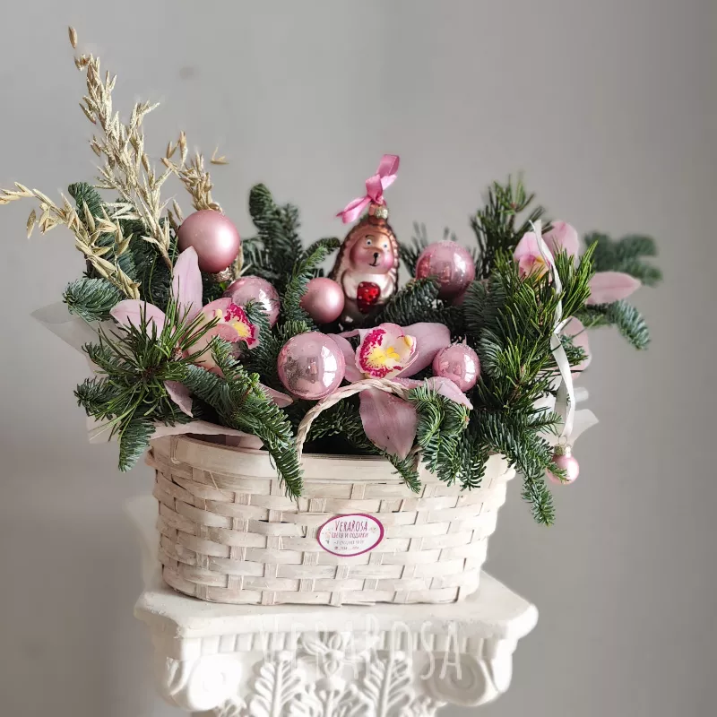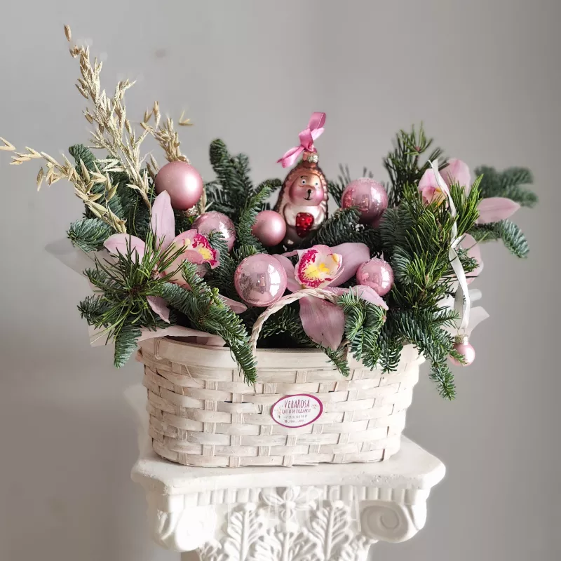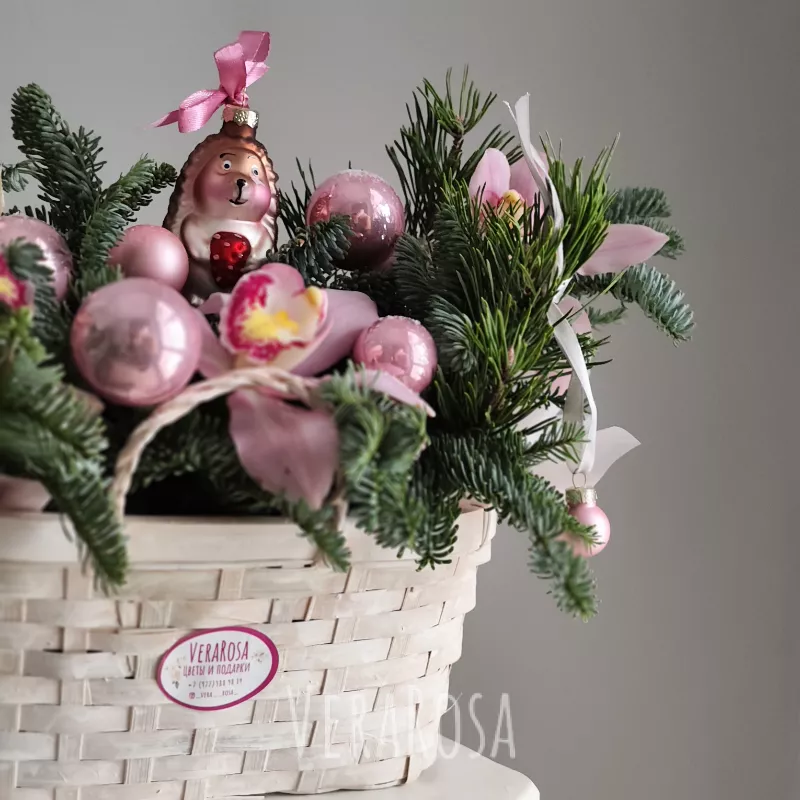Новогодняя композиция в корзине с орхидеями. Декорирована елочными игрушками,и атласными лентами.