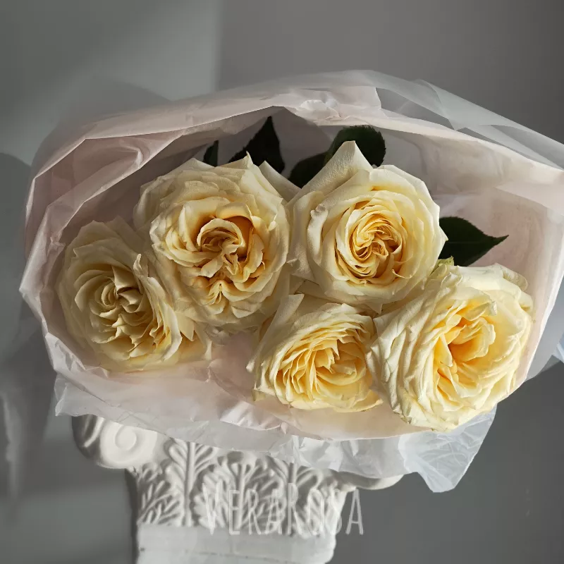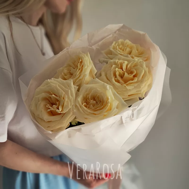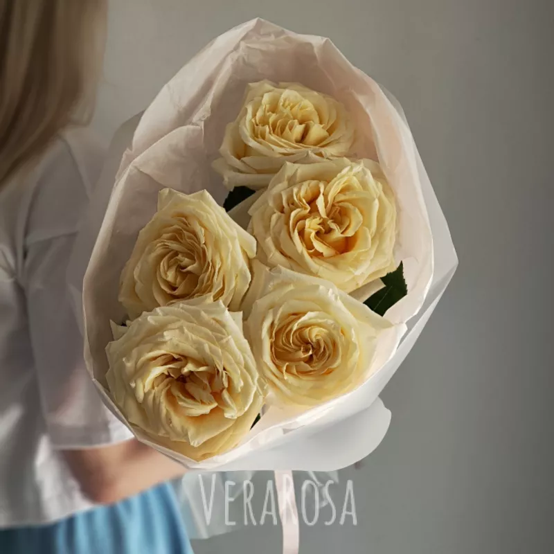 Стильный букет из роз сливочного оттенка.. Оформлен в упаковку и атласные ленты.