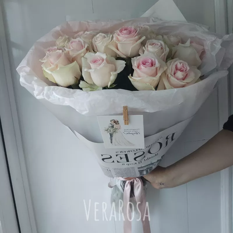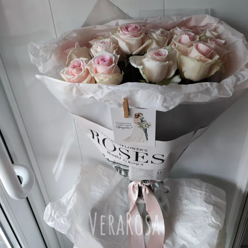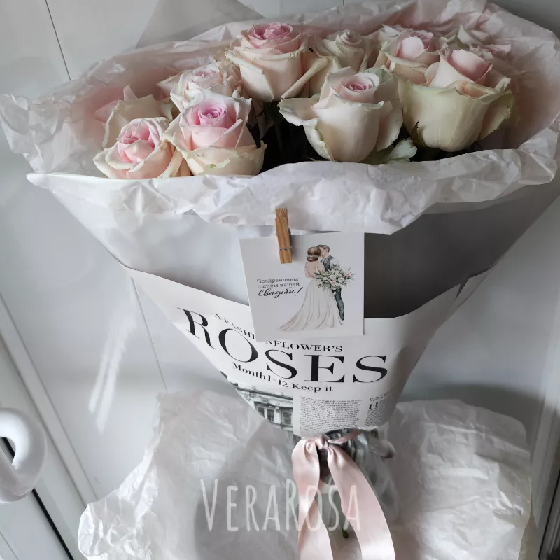 Кустовые розы были органично обрамлены веточками эвкалипта и гипсофилами. Спасибо вашей команде за то, что учли все мои пожелания. Лучшие
