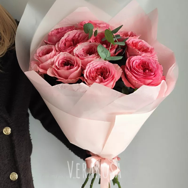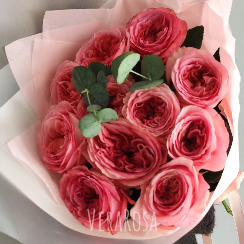 Кустовые розы были органично обрамлены веточками эвкалипта и гипсофилами. Спасибо вашей команде за то, что учли все мои пожелания. Лучшие