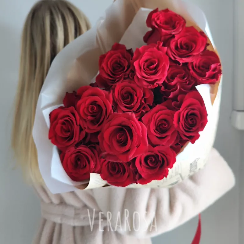Букет из 15 роскошных красных роз, великолепно оформленный в винтажной газетной обертке и дополненный атласной лентой насыщенного алого цвета. Это классическое сочетание цветов и стильного дизайна создает выразительный образ, идеальный для особого случая или романтического подарка.
