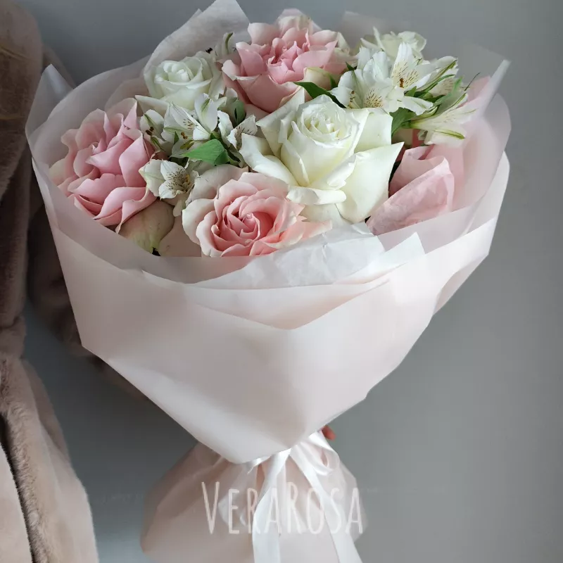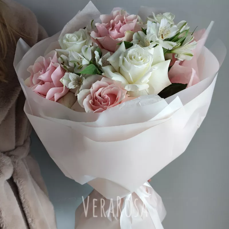 Букет, составленный из розовых и белых роз, дополненный белыми альстромериями. Нежные оттенки цветов создают атмосферу легкости и воздушности, делая букет идеальным для любого торжества. Композиция выглядит изысканно и гармонично, подчеркивая красоту и свежесть входящих в него цветов.