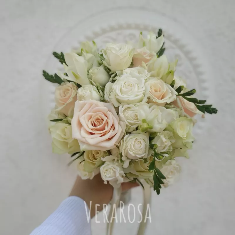 Кустовые розы были органично обрамлены веточками эвкалипта и гипсофилами. Спасибо вашей команде за то, что учли все мои пожелания. Лучшие