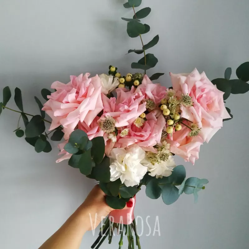 Кустовые розы были органично обрамлены веточками эвкалипта и гипсофилами. Спасибо вашей команде за то, что учли все мои пожелания. Лучшие